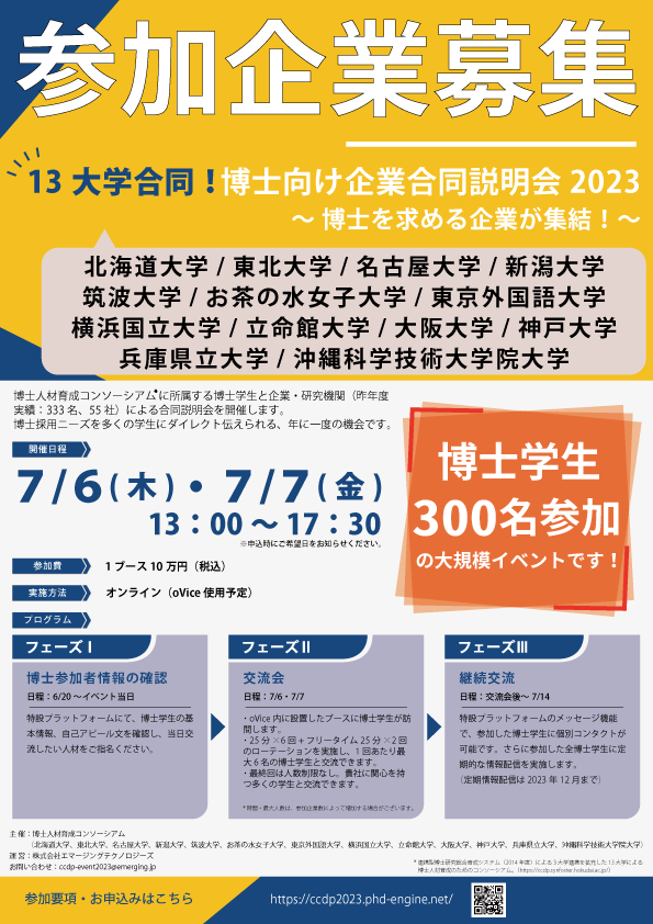 博士人材育成コンソーシアム*に所属する博士学生300名(昨年度実績:333名)に、博士採用ニーズをダイレクト伝えられる、年に一度の機会です。